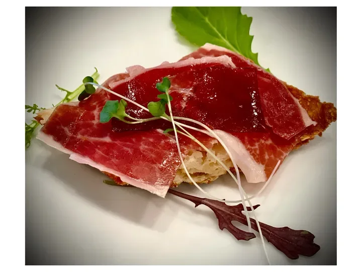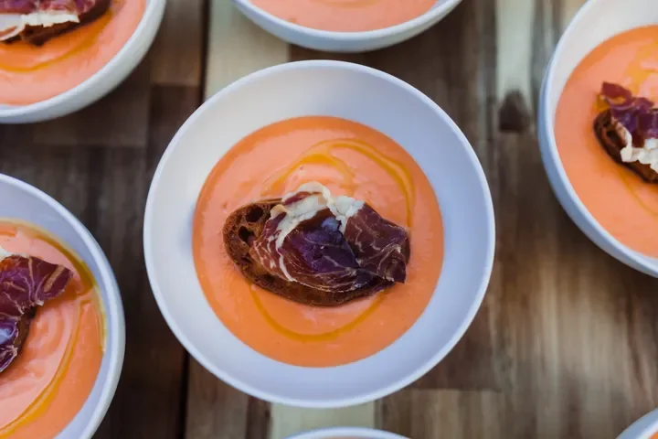 Made with organic tomatoes, bread, garlic and a extra virgin Olive Oil. Served with Iberico Pork Dry-Cured Ham 3 years cured