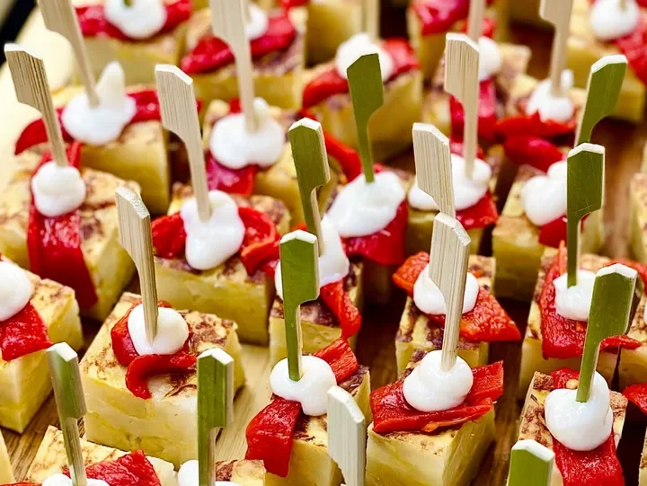 Classic Spanish omelette serve with aioli and piquillo peppers (small toothpick bites).