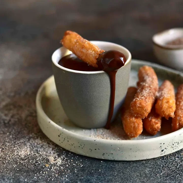 Xurros are made with organic flour and covered with sugar, then served with hot chocolate