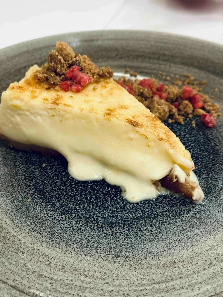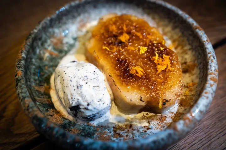 Brioche bread soaked in coconut milk flavored with spices and citrus. Then we torch it just like a cream brûlée giving it a fine crystallized layer of sugar. Accompanied with local vanilla ice cream