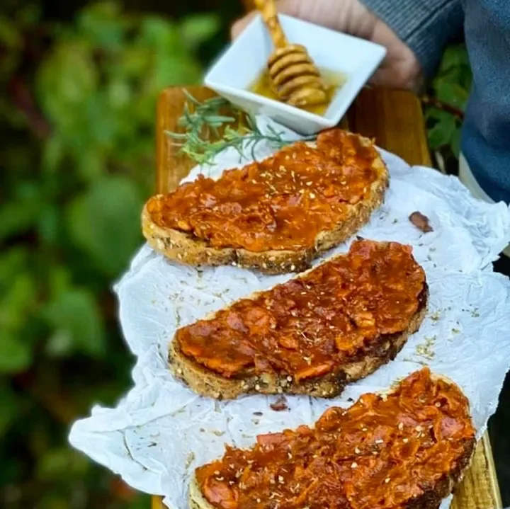 Grilled sobrassada from Minorca, with local honey on homemade bread. Open fire cooking wiht the OFYR.