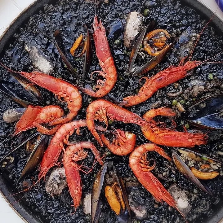 Made with local spot prawns or white shrimp, local mussels, squid and cooked in its own ink