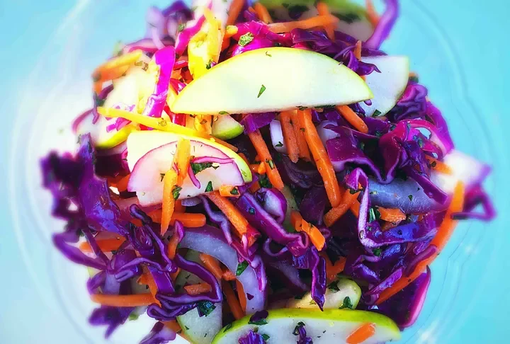 Cabbage, green apples, carrots, cilantro and mint with an asian seasoning.. very fresh and delicious!