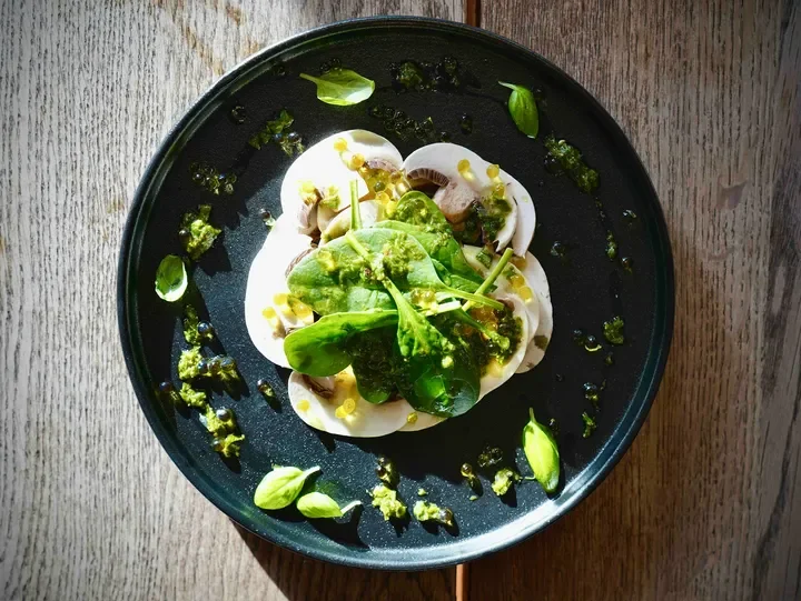 Mushroom carpaccio with EVO caviar, baby spinach and a citric vinaigrette with basil and Sichuan pepper