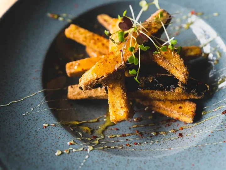 Eggplant breaded in semolina with local honey and Aleppo pepper