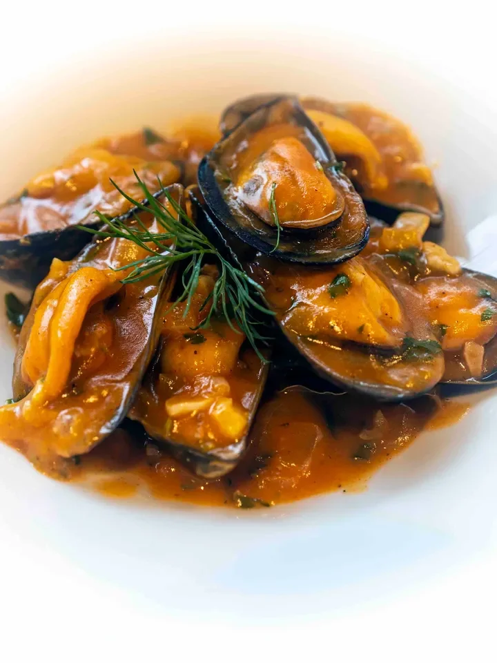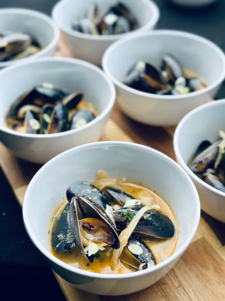 Local mussels from Westcott Bay, Indian curry. cilantro, coconut cream, fresh ginger, sesame oil.