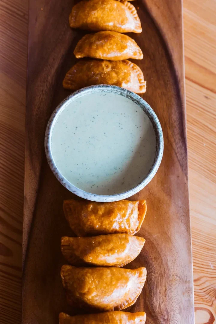 Our empanadas. Made with a vegetable based dough, with no animal product. Filled with a delicious sofrito with excellent quality local Albacore and local eggs. The Cilantro aioli is made with avocado oil and citric