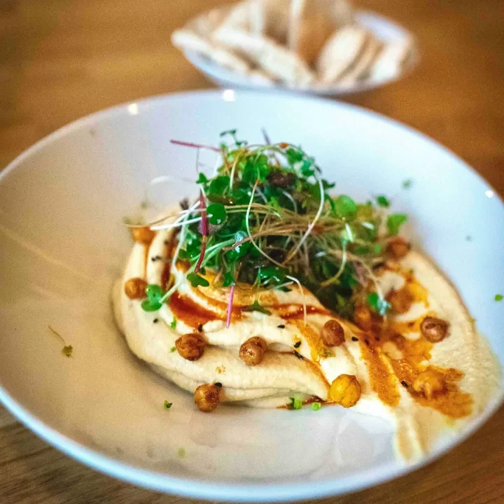 Made with garbanzo beans,Tahini, lemon juice, garlic and a little yogurt. Served with a mix of spices, olive oil, micro-greens and you can't miss some crunchy chickpeas.